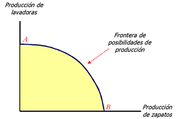 El siguientes gráfico (frontera de posibilidades de producción) muestra las diferentes combinaciones de lavadoras y zapatos que puede fabricar.La "frontera de posibilidades de producción" representa la disyuntiva entre fabricar un bien u otro.