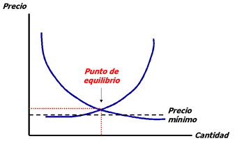 En cambio, si el precio mínimo es superior al precio de equilibrio este tope impedirá al mercado alcanzar su punto de equilibrio. El precio se situará en dicho nivel mínimo donde la cantidad ofrecida será mayor que la cantidad demandada, lo que provocará un exceso de oferta que quedará sin vender.